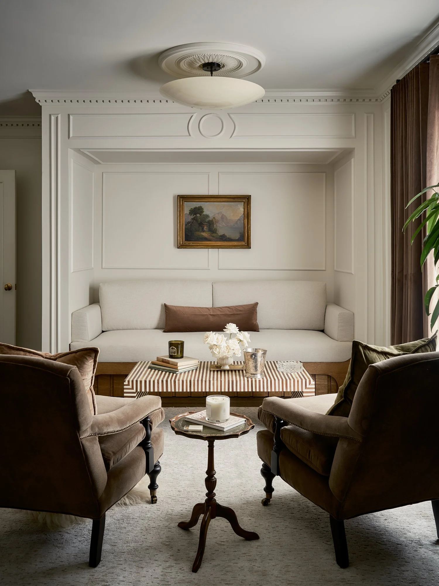 At the heart of the space is the stunning plaster fireplace. Natural materials, tailored silhouettes, and rich textures together to create a room that feels both grounding and quietly captivating.